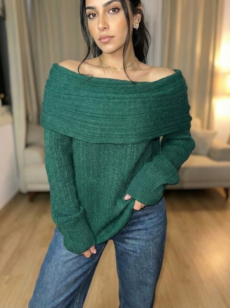 The Vibe: Stop scrolling, bestie. ✋ This is the knit your winter wardrobe has been waiting for. The Emerald Green Off-Shoulder Knit serves major main character energy. It’s the perfect balance of cozy and chic, featuring a slouchy fold-over neckline that lets you show off your favorite layered necklaces effortlessly.
