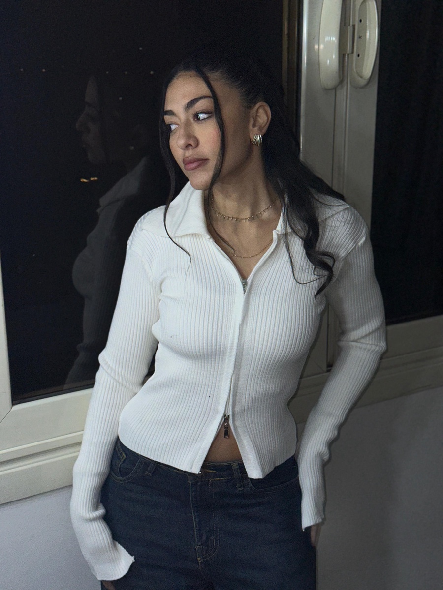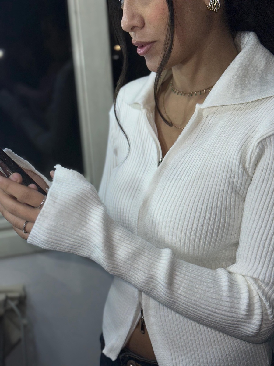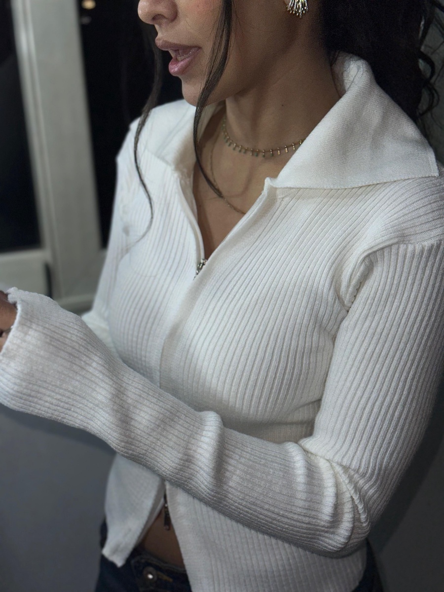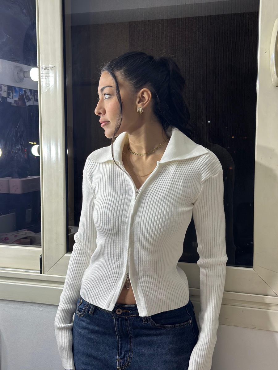 White Double Zip Ribbed Collar Top